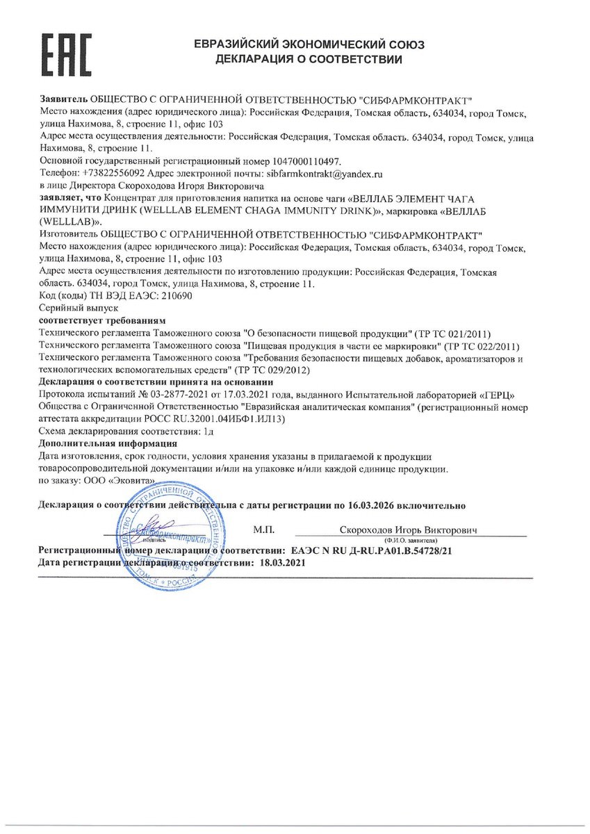 СОСТАВ: гриб чага, чаги экстракт, цинка сульфат, аскорбиновая кислота (витамин С), крахмал картофельный (носитель), рутин, холекальциферол (витамин D).